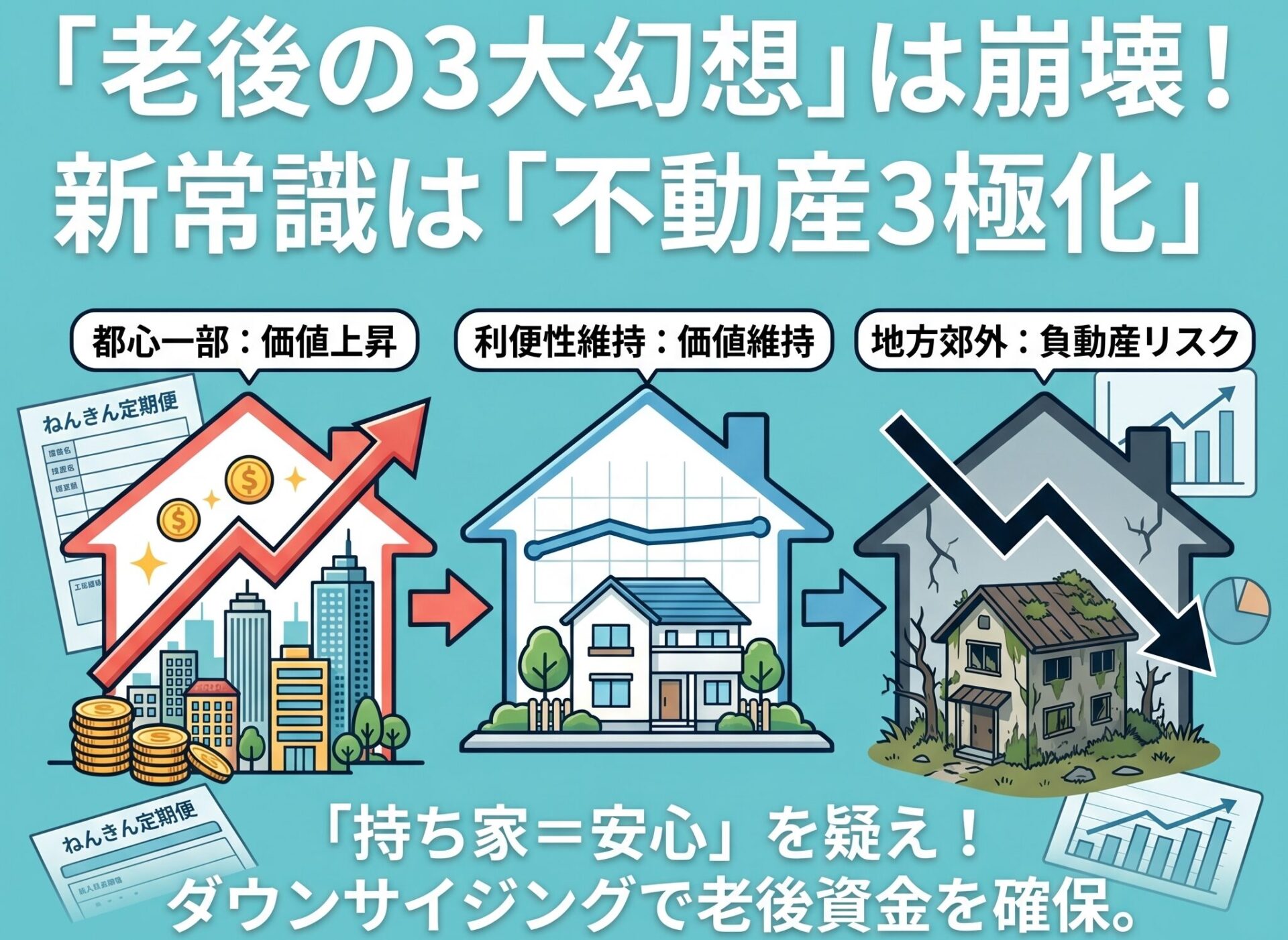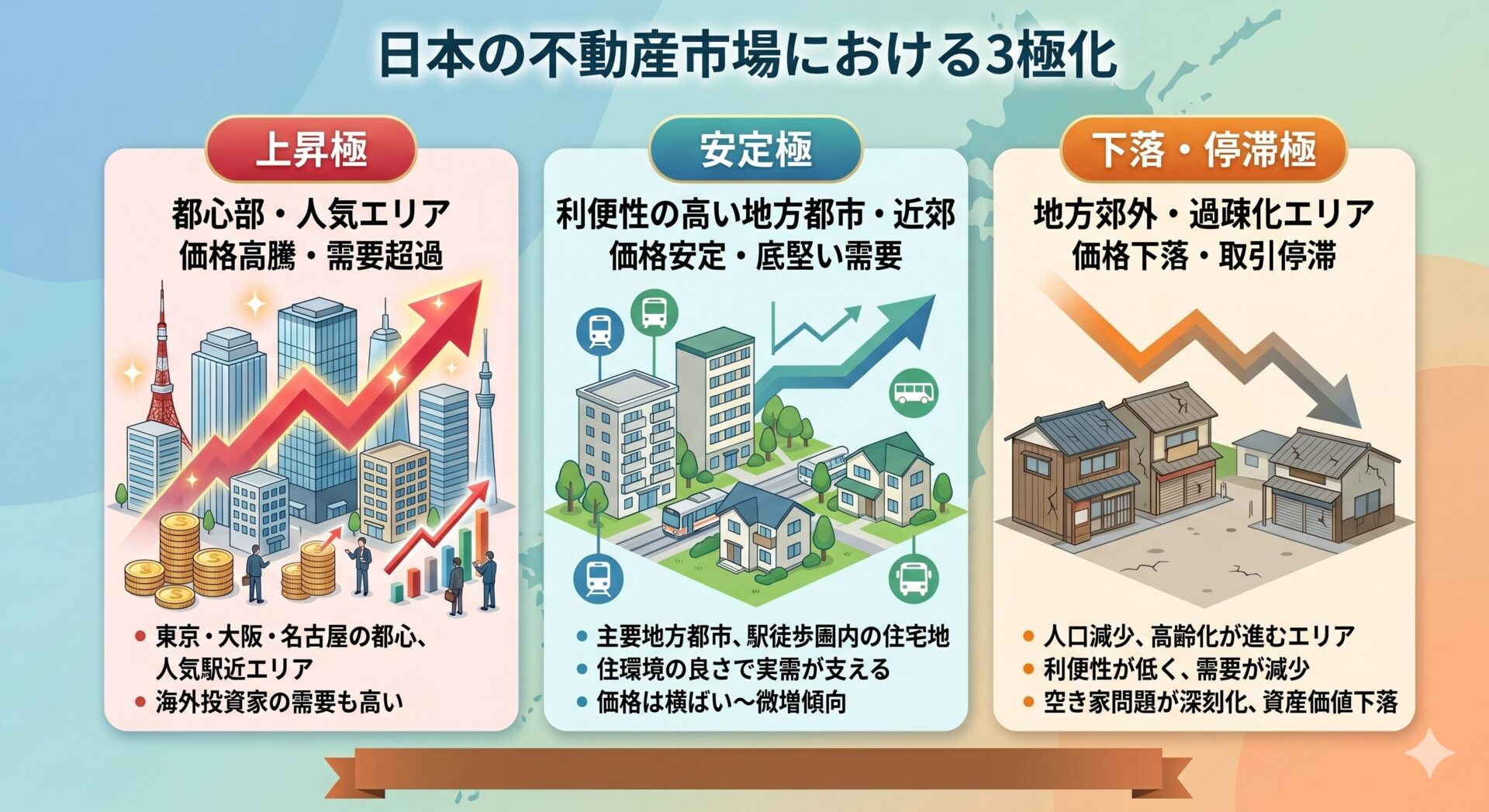 固定資産税、管理費、そして数百万単位でかかる突発的な修繕費。家を持ち続ける限り、コストは発生し続けます。さらに恐ろしいのが、不動産の「3極化」です。